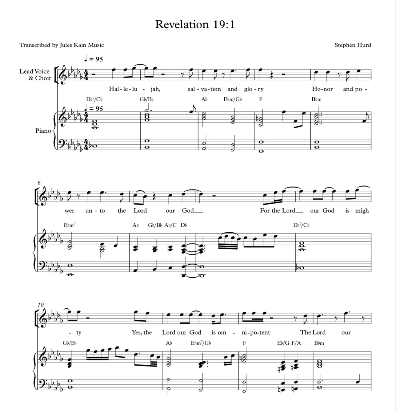 Choir Parts For Gospel Musicians › Revelation 19:1 - Choir Parts - Steven Hurd - Sheet Music Image 1 of 2 Image 2 of 2 Revelation 19:1 - Choir Parts - Steven Hurd - Sheet Music $20.00 Get notified by email when this product is in stock. Sign up to receive news and updates. Add To Cart Added! Sheet Music with Choir Parts for A. Jeffrey LaValley’s “Revelation 19” (Hallelujah, Salvation and Glory) Sheet Music with Choir Parts for A. Jeffrey LaValley’s “Revelation 19” (Hallelujah, Salvation and Glory) Reviews Reviewer Name Review Date Star Rating Description Posted on Etsy Product Show More